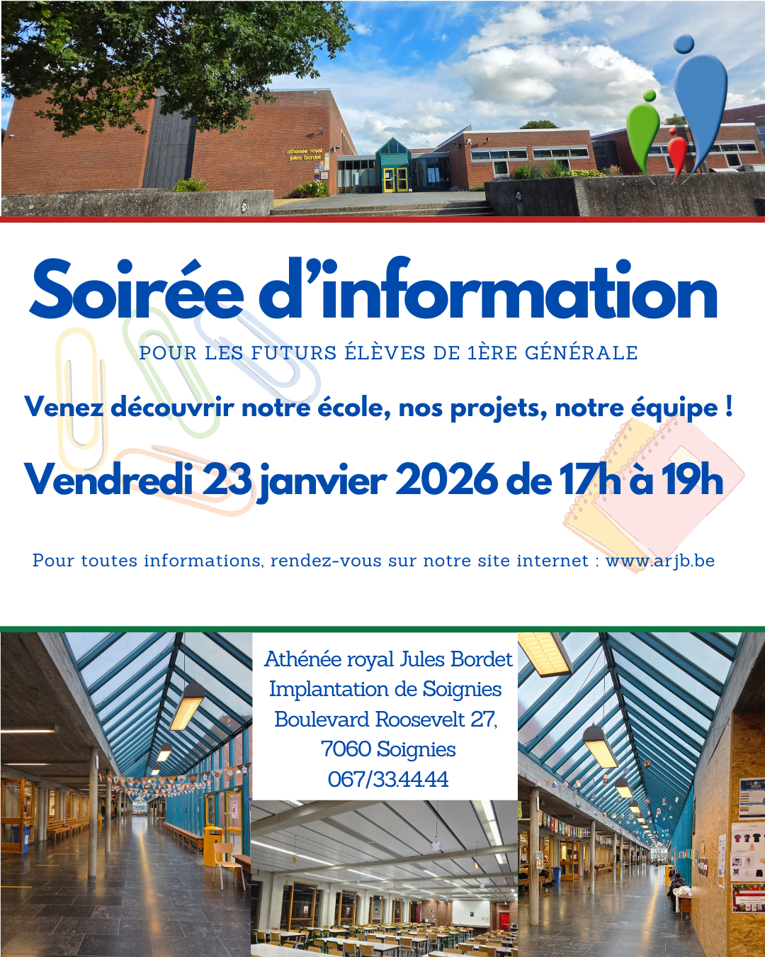 Venez découvrir notre école ! Quand ? Vendredi 23 janvier 2026 À quelle heure ? De 17h00 à 19h00 Où ? Boulevard Roosevelt, 27 à SOIGNIES Chers (futurs) élèves, chers parents, Nous avons le plaisir de vous convier à une soirée d’information concernant l’ARJB Secondaire de Soignies. Ce sera l’occasion de : Découvrir notre école, […]